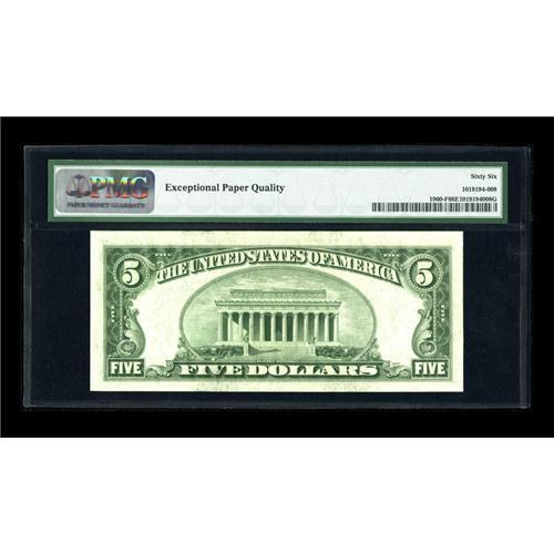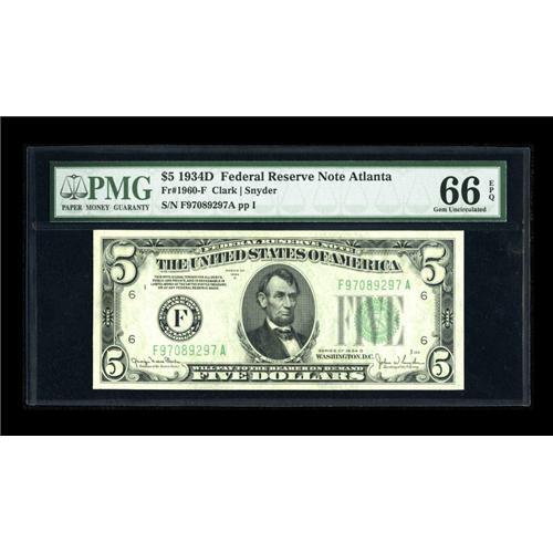 <B>Fr. 1960-F $5 1934D Federal Reserve Note. PMG Gem Uncirculated 66 EPQ.</B></I><BR>Nearly 9.6 million notes were printed for the Atlanta Series 1934D, more than the totals for five other different districts, yet it remains the key. Uncirculated notes are especially scarce after attrition depleted the majority of the issue. This piece features broad borders and original surfaces.<BR><BR><b>Shipping:</b> Coins & Currency (<a target="_blank" href="http://www.heritageauctions.com/common/shipping.php">view shipping information</a>)