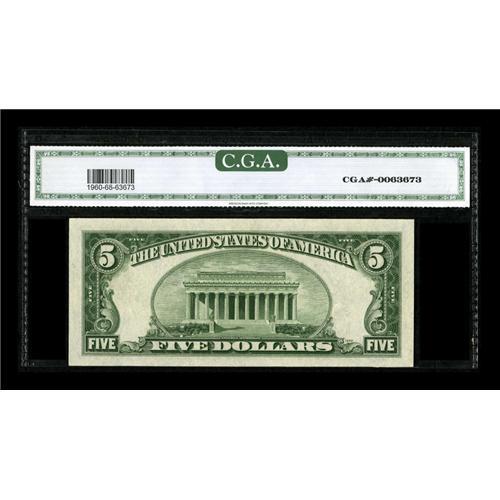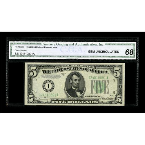 <B>Fr. 1960-I $5 1934D Federal Reserve Note. CGA Gem Uncirculated 68.</B></I><BR>Titanic margins and good embossing are seen on this very scarce district note that lists for $600 in CU in Schwartz. It has been almost five years since we offered an example of this district and this one is about ten points its superior on the grading scale.<BR><BR><b>Shipping:</b> Coins & Currency (<a target="_blank" href="http://www.heritageauctions.com/common/shipping.php">view shipping information</a>)