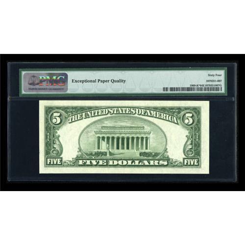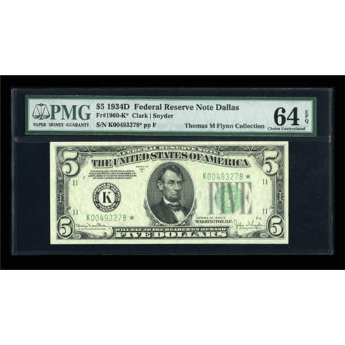 <B>Fr. 1960-K* $5 1934D Federal Reserve Note. PMG Choice Uncirculated 64 EPQ.</B></I><BR> A very rare star in any grade, with this the only serial number listed in the new small size catalogue save for the ending number printed. PMG has been every conservative here, as we would have unhesitatingly called this fresh and original beauty a gem. <BR><I>From The Thomas M. Flynn Collection</B></I><BR><BR><b>Shipping:</b> Coins & Currency (<a target="_blank" href="http://www.heritageauctions.com/common/shipping.php">view shipping information</a>)