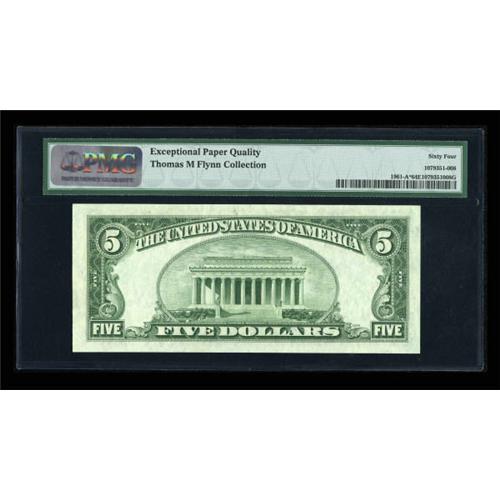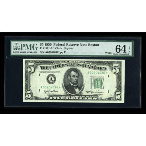<B>Fr. 1961-A* $5 1950 Wide Federal Reserve Note. PMG Choice Uncirculated 64 EPQ.</B></I><BR> A lovely star example from a scarcer district. While the centering is not perfect, we see little reason that this EPQ note was not accorded the gem designation. <BR><I>From The Thomas M. Flynn Collection</B></I><BR><BR><b>Shipping:</b> Coins & Currency (<a target="_blank" href="http://www.heritageauctions.com/common/shipping.php">view shipping information</a>)