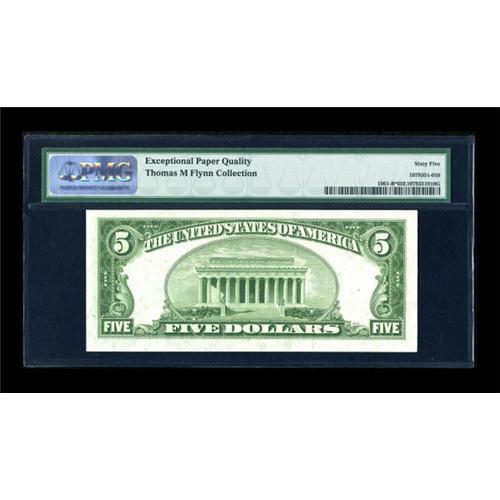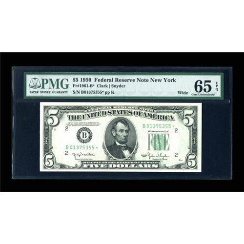 <B>Fr. 1961-B* $5 1950 Wide Federal Reserve Note. PMG Gem Uncirculated 65 EPQ.</B></I><BR> A well centered and fully original gem with plenty of embossing evident.<BR><I>From The Thomas M. Flynn Collection</B></I><BR><BR><b>Shipping:</b> Coins & Currency (<a target="_blank" href="http://www.heritageauctions.com/common/shipping.php">view shipping information</a>)