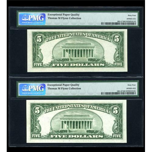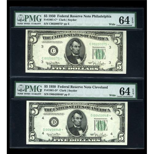 <B>Fr. 1961-C* $5 1950 Wide Federal Reserve Note. PMG Choice Uncirculated 64 EPQ.<BR>Fr. 1961-D* $5 1950 Wide Federal Reserve Note. PMG Choice Uncirculated 64 EPQ.</B></I><BR> A pair of PMG graded Choice Uncirculated 64 Wide stars, both very close to the full Gem category. <BR><I>From The Thomas M. Flynn Collection</B></I><BR><BR><b>Shipping:</b> Coins & Currency (<a target="_blank" href="http://www.heritageauctions.com/common/shipping.php">view shipping information</a>)