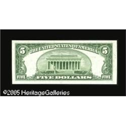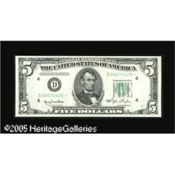 <B>Fr. 1961-D* $5 1950 Wide II Federal Reserve Note. Gem Crisp Uncirculated.</B></I><BR>We originally sold this note with back plate number 2086 in September, 2003, and the description read in part, "A new discovery of considerable significance to collectors of small size star notes, as hitherto no star examples have been reported of the Wide II variety for any of the 12 issuing districts. Fortunately for the collecting fraternity, this specimen is a lovely fully original gem, with wonderful centering and no defects of any kind whatever." The fifth edition of Oakes has been released since then, and a Philly Wide II star has been recorded. Still, this is an important rarity, and who knows when the next opportunity will be to acquire a Wide II star. Lot:15947