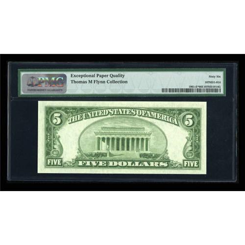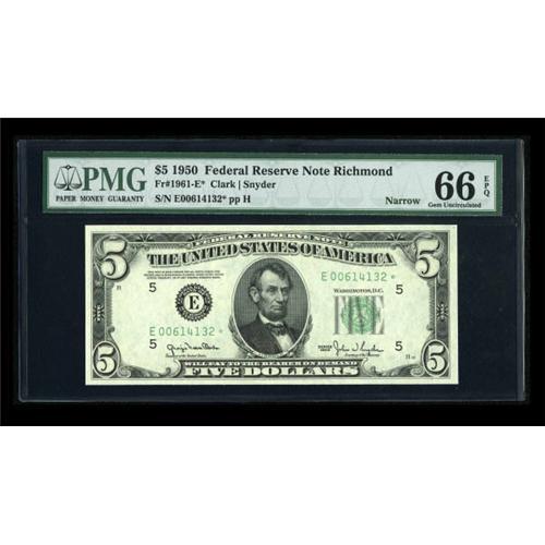 <B>Fr. 1961-E* $5 Narrow 1950 Federal Reserve Note. PMG Gem Uncirculated 66 EPQ.</B></I><BR> A beautiful example which is the finest 1950 $5 Richmond district star of any kind to be graded by PMG.<BR><I>From The Thomas M. Flynn Collection</B></I><BR><BR><b>Shipping:</b> Coins & Currency (<a target="_blank" href="http://www.heritageauctions.com/common/shipping.php">view shipping information</a>)