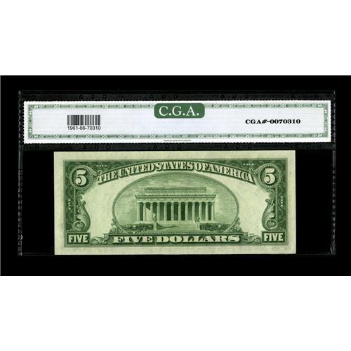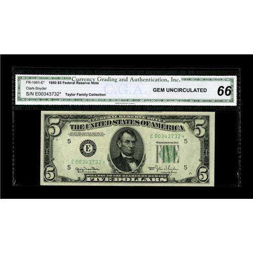 <B>Fr. 1961-E* $5 1950 Wide Federal Reserve Note. CGA Gem Uncirculated 66.</B></I><BR>An enormously margined and well embossed example of this difficult star which comes from our sale of the Taylor Family Collection.<BR><BR><b>Shipping:</b> Coin/Currency (<a target="_blank" href="http://www.heritageauctions.com/common/shipping.php">view shipping information</a>)