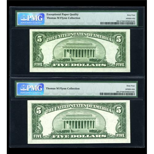<B>Fr. 1961-E* $5 1950 Wide Federal Reserve Note. PMG Choice Uncirculated 64 EPQ.<BR>Fr. 1961-F* $5 1950 Wide Federal Reserve Note. PMG Choice Uncirculated 64.</B></I><BR> A pair of bright and original $5 1950 Wide stars from the two southern districts. <BR><I>From The Thomas M. Flynn Collection</B></I><BR><BR><b>Shipping:</b> Coins & Currency (<a target="_blank" href="http://www.heritageauctions.com/common/shipping.php">view shipping information</a>)