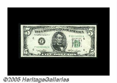 <B>Fr. 1961-F $5 1950 Federal Reserve Note. Choice-Gem CU.</B></I><BR>Serial number 2 graces this peach of a note from Atlanta that exhibits strong embossing. This note's provenance began with a highly placed official at the Atlanta Federal Reserve Bank.