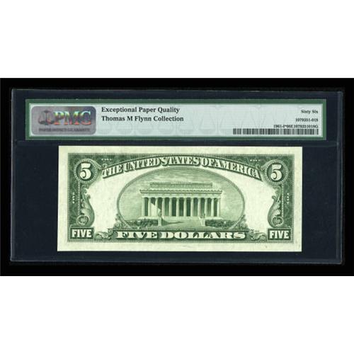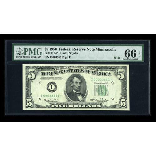 <B>Fr. 1961-I* $5 1950 Wide Federal Reserve Note. PMG Gem Uncirculated 66 EPQ.</B></I><BR> A well nigh perfect example with great centering and complete originality. This is by far the scarcest district for stars in this series, with this the only star example yet graded by PMG.<BR><I>From The Thomas M. Flynn Collection</B></I><BR><BR><b>Shipping:</b> Coins & Currency (<a target="_blank" href="http://www.heritageauctions.com/common/shipping.php">view shipping information</a>)