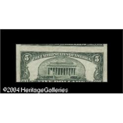 Fr. 1962-D $5 1950A Federal Reserve Note. Choice Cris <B>Fr. 1962-D $5 1950A Federal Reserve Note. Choice Crisp Uncirculated.</B></I> The reverse is skewed off center, showing part of the adjacent note on the sheet. <BR><BR><B>Important notice:</B> Heritage usually auctions material at the rate of 200-250 lots per hour. On some occasions eBay Live bid software or the Internet may not be able to keep up with the pace of the auction. We recommend placing a realistic absentee bid now as insurance to avoid disappointment. Occasionally the auctioneer may eliminate or reject an eBay Live bid, and the auctioneer may also reopen a lot after the close of the eBay live bidding (usually because we missed an audience bid), and may reject your bid even if it shows you as the winning bidder. By bidding via eBay Live, you agree that Heritage may award the lot to another bidder at its sole discretion under the circumstances described above or any other reasonable circumstances. Since eBay bids are not shown to us until we open the lot on the floor, we treat those bids just like floor bids. In most cases the floor responds before the eBay bid is presented to us, due to Internet lag time, so for consistency we have made it a policy that floor bids are always considered first over tie eBay live bids. Also please note that all Heritage lots purchased through eBay Live carry a 20% Buyer's Premium. Please make sure you read the Terms and Conditions before you bid. This lot is being auctioned in conjunction with a live floor auction by Heritage Galleries & Auctioneers. All final auction and invoice information will be supplied by Heritage Galleries & Auctioneers, and all other information should be considered preliminary. Lot:16097