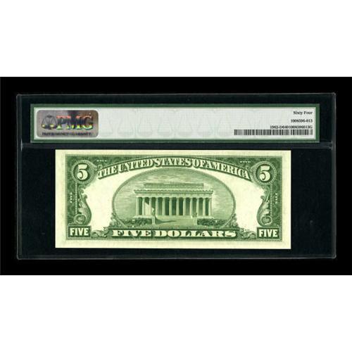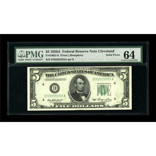 <B>Fr. 1962-D $5 1950A Federal Reserve Note. Solid Five Serial Number PMG Choice Uncirculated 64.</B></I><BR> Nothing says "Wow!" like solid fives on a $5 FRN. Dark inks on bright paper await the lucky bidder.<BR><BR><b>Shipping:</b> Coins & Currency (<a target="_blank" href="http://www.heritageauctions.com/common/shipping.php">view shipping information</a>)