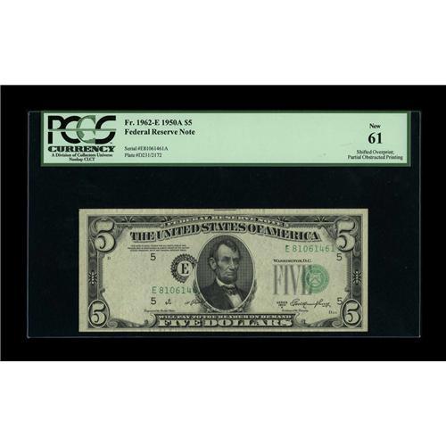 <B>Fr. 1962-E $5 1950A Federal Reserve Note. PCGS New 61.</B></I><BR>A couple of blunders occurred at the BEP with this one. A shift of the overprint and an obstruction of the black portion of the overprint has given us a neat item.<BR><BR><b>Shipping:</b> Coin/Currency (<a target="_blank" href="http://www.heritageauctions.com/common/shipping.php">view shipping information</a>)