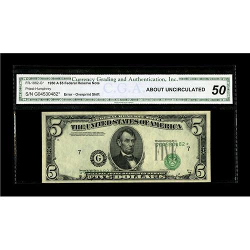 <B>Fr. 1962-G* $5 1950A Federal Reserve Note. CGA About Uncirculated 50.</B></I><BR>A lovely overprint shift on a replacement note that has the print shifted down and to the right a touch.<BR><BR><b>Shipping:</b> Coin/Currency (<a target="_blank" href="http://www.heritageauctions.com/common/shipping.php">view shipping information</a>)