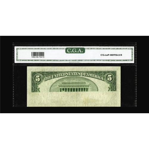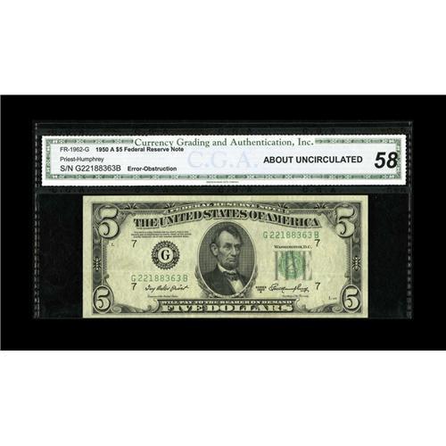<B>Fr. 1962-G $5 1950A Federal Reserve Note. CGA About Uncirculated 58.</B></I><BR>This obstruction affected almost 40% of the back printing as perhaps a stray piece of paper lay along the sheet prior to the first printing.