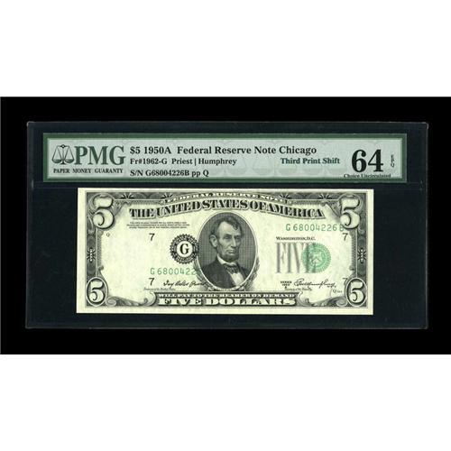 <B>Fr. 1962-G $5 1950A Federal Reserve Note. PMG Choice Uncirculated 64 EPQ.</B></I><BR>The third printing is shifted to the right and into the portrait area on this well preserved $5.<BR><BR><b>Shipping:</b> Coins & Currency (<a target="_blank" href="http://www.heritageauctions.com/common/shipping.php">view shipping information</a>)