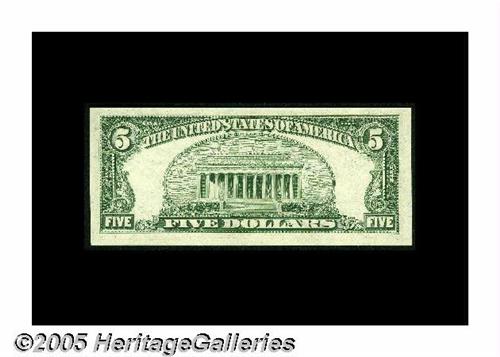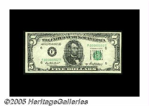 <B>Fr. 1963-F $5 1950B Federal Reserve Note. Very Choice Crisp Uncirculated.</B></I><BR>This is a worthy companion to the serial number 1 example offered above, and of course from the same estate, with this note bearing serial number F00000002C. As are both pieces, it is crackling-fresh and appears to have come off of the press this morning. Hopefully, it will stay with its companion as part of an important collection, as the pair make a wonderful display item.