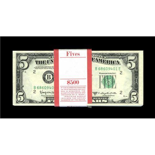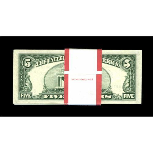 <B>Fr. 1965-D $5 1950D Federal Reserve Notes. Original Pack of 100. Choice Crisp Uncirculated.</B></I><BR>You don't see packs of FRNs very often from this era.<BR><BR><b>Shipping:</b> Coin/Currency (<a target="_blank" href="http://www.heritageauctions.com/common/shipping.php">view shipping information</a>)