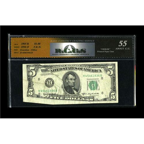 <B>Fr. 1965-H $5 1950D Federal Reserve Note. RCGS About CU 55.</B></I> The paper jammed as it was being fed through the press, resulting in the note being printed over multiple folds and crinkles.