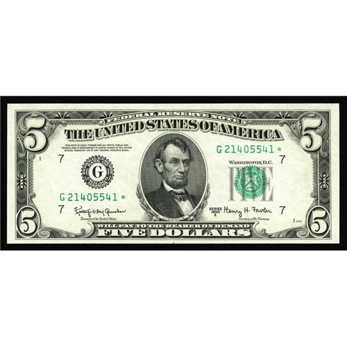 Fr. 1966-G* $5 1950E Federal Reserve Star Note. Gem Cri Fr. 1966-G* $5 1950E Federal Reserve Note. G
