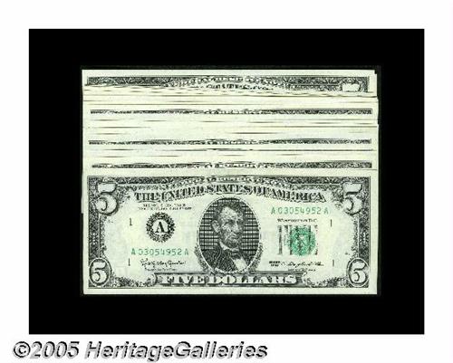 <B>Fr. 1967-A-L* $5 1963 Federal Reserve Notes. Complete Block Set with Stars. Choice Crisp Uncirculated or Better.</B></I><BR>This is an attractive complete set that was current from 1964-5. Richmond and Minneapolis did not issue any $5s for the 1963 Series. Also, this group contains a duplicate K-A example.<BR>