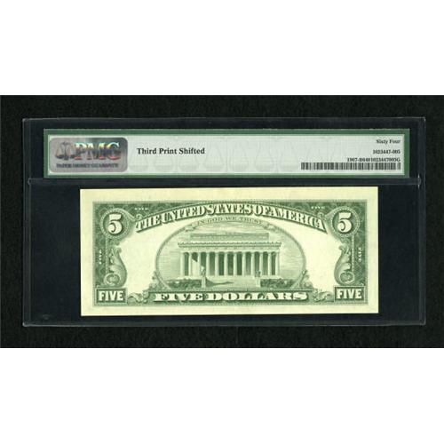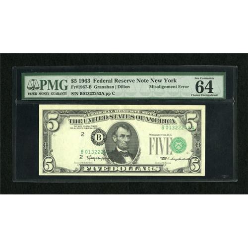 <B>Fr. 1967-B $5 1963 Federal Reserve Note. PMG Choice Uncirculated 64.</B></I><BR> The third print is shifted right, into the portrait.<BR><BR><b>Shipping:</b> Coins & Currency (<a target="_blank" href="http://www.heritageauctions.com/common/shipping.php">view shipping information</a>)
