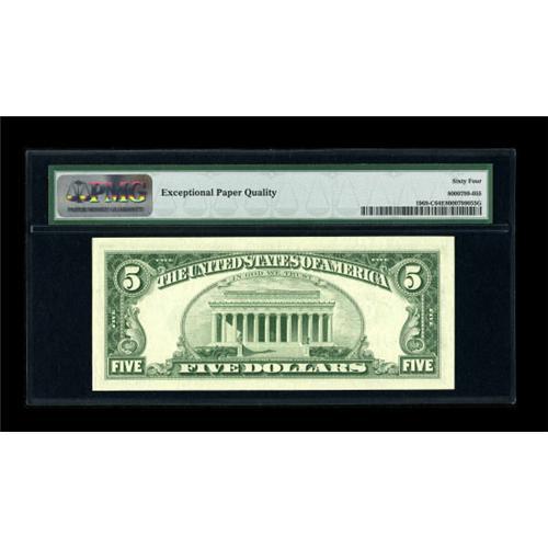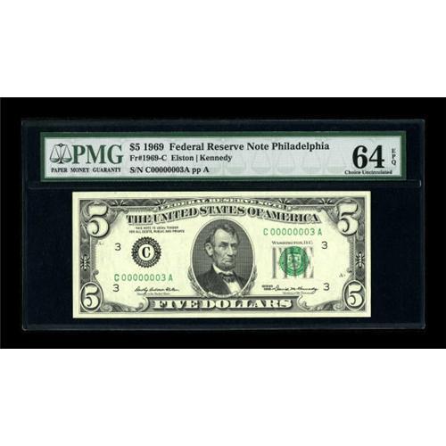<B>Fr. 1969-C $5 1969 Federal Reserve Note. PMG Choice Uncirculated 64 EPQ.</B></I><BR> Gem quality margins and solid embossing are noted on this attractive issue. This piece boasts a low serial number C00000003A.<BR><BR><b>Shipping:</b> Coins & Currency (<a target="_blank" href="http://www.heritageauctions.com/common/shipping.php">view shipping information</a>)