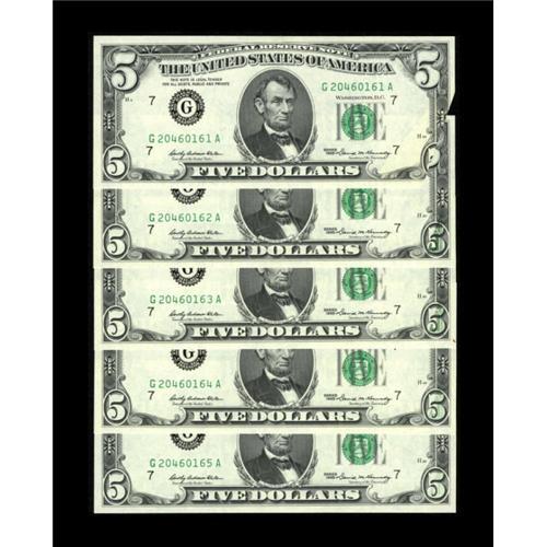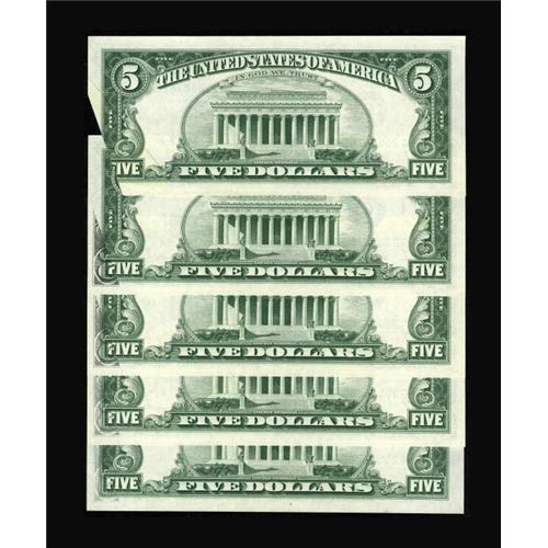 <B>Fr. 1969-G $5 1969 Federal Reserve Notes. Five Consecutive Examples Gem Crisp Uncirculated.</B></I><BR> The first note in this scarce grouping exhibits a neat foldover while the remaining four notes show partial offsets on both sides to match it. A neat item which will find a welcome home in an advanced error collection.<BR><BR><b>Shipping:</b> Coins & Currency (<a target="_blank" href="http://www.heritageauctions.com/common/shipping.php">view shipping information</a>)