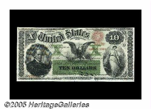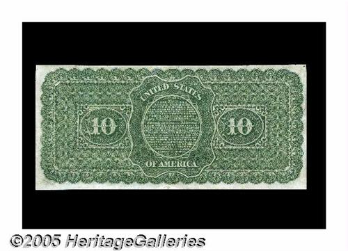 <B>Fr. 196a $10 1863 Interest Bearing Note Extremely Fine-About New.</B></I> One of about two dozen examples known in all grades combined, with none of them grading better than this piece. The note has a few tiny pinholes and a small repair at the bottom of its light center-fold, but it has great color and excellent eye-appeal.
