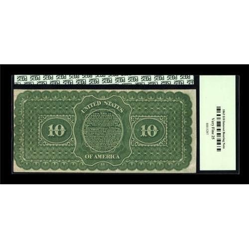 <B>Fr. 196a $10 1863 Interest Bearing Note PCGS Very Fine 25.</B></I> Four previous pedigrees appear on the PCGS holder for this handsome and scarce Interest Bearing Note. It reads, "ex:Grinnell; Boyd; Friedberg; Carter." The paper is solid, and the details remain bold and unaffected by the few folds that account for the grade.<BR><BR><b>Shipping:</b> Coins & Currency (<a target="_blank" href="http://www.heritageauctions.com/common/shipping.php">view shipping information</a>)