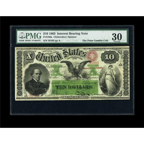 <B>Fr. 196a $10 1863 Interest Bearing Note PMG Very Fine 30.</B></I> This handsome note is just about in the middle of the condition census for the number. No Uncirculated examples have reached the auction block, and most survivors fall just below the grade of this handsome piece. The colors and margins are excellent and the PMG holder is free of negative comments. Just under 30 examples of this number are known, and very few, including the higher grade pieces, are as problem-free and attractive as this note. <I>Ex: Albert A. Grinnell</B></I><BR><I>From The Peter Gamble Collection.</B></I><BR><BR><b>Shipping:</b> Coins & Currency (<a target="_blank" href="http://www.heritageauctions.com/common/shipping.php">view shipping information</a>)