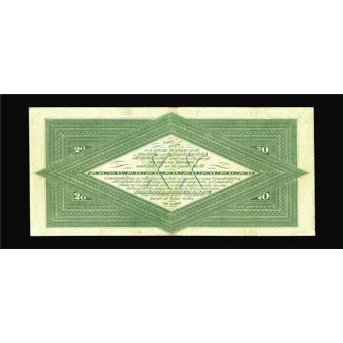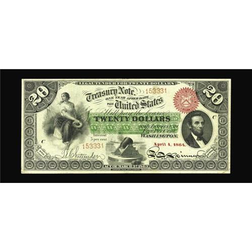 <B>Fr. 197 $20 1863 Interest Bearing Note Very Fine-Extremely Fine.</B></I> One of only nine known examples reported and a piece which traces its pedigree back to Wayte Raymond. It's a gorgeous note with excellent margins, perfect colors, and tremendous eye appeal. The reference works make the distinction between Fr. 197 and Fr. 197a as Fr. 197's having been printed by the American Bank Note Company and Fr. 197a as being printed by the Bureau of Engraving and Printing. Either a third variety exists or the references are wrong. Both this note and the only other two Fr. 197s that we have handled have both the American Bank Note Company imprint on the left and the National Bank Note Company imprint at the bottom under the Act date. We sold the Taylor Family example of this Friedberg number in a similar grade in February 2005 for $63,250. This note shoud do just as well if not better.<BR><I>From The Plymouth Rock Collection</B></I>