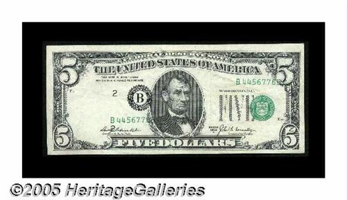 <B>Fr. 1970-B $5 1969A Federal Reserve Note. Fine-Very Fine.</B></I> The third printing is shifted into Lincoln's portrait on this $5.
