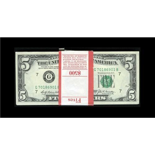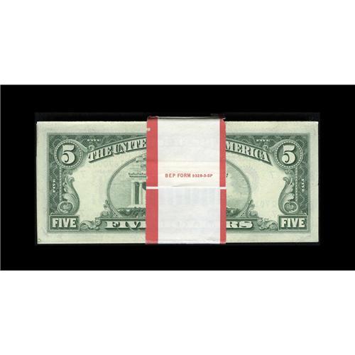 <B>Fr. 1970-G $5 1969A Federal Reserve Notes. Original Pack of 100 Very Choice Crisp Uncirculated.</B></I><BR>The catalog value of these notes is $20 each. Here is an original BEP strapped pack that is sure to please. The first and last notes exhibit minor dings on the corners but, all the notes remain well embossed.
