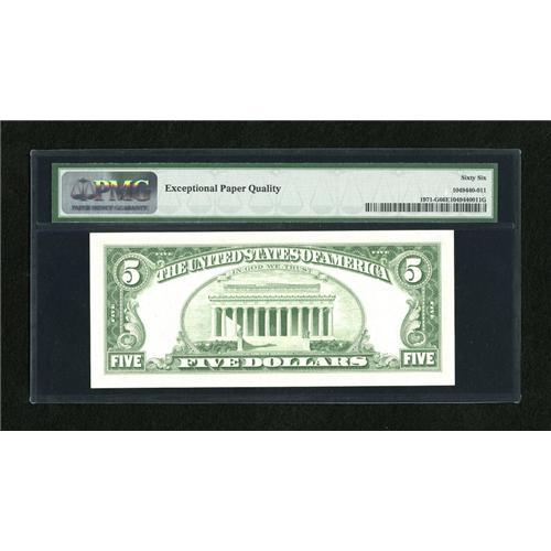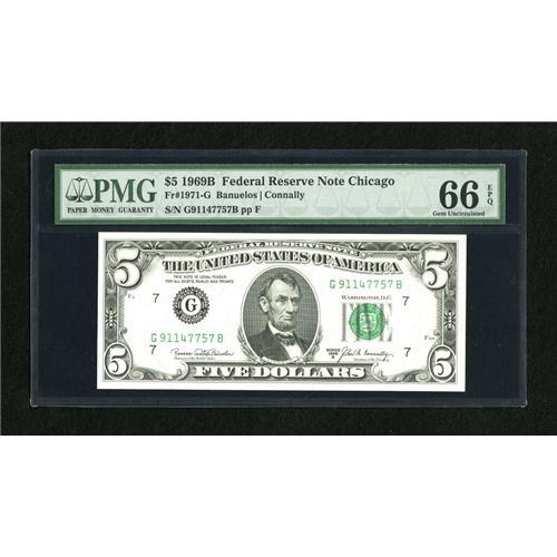 <B>Fr. 1971-G $5 1969B Federal Reserve Note. PMG Gem Uncirculated 66 EPQ.</B></I><BR>This is singlehandedly one of the nicest examples of this scarce series that this cataloger has ever seen.<BR><I>From The Bill and Kathy Stella Currency Collection</B></I><BR><BR><b>Shipping:</b> Coins & Currency (<a target="_blank" href="http://www.heritageauctions.com/common/shipping.php">view shipping information</a>)