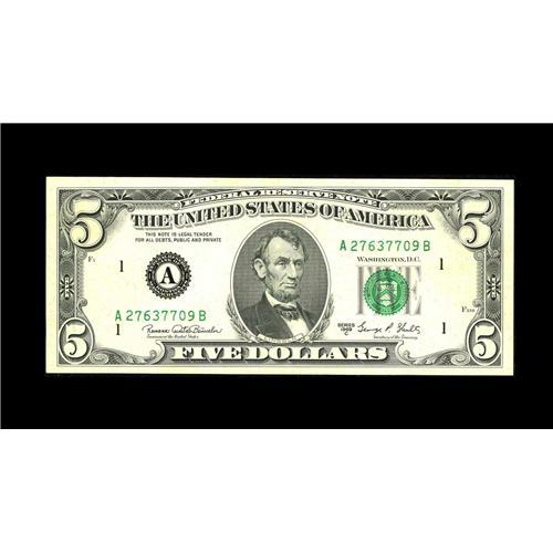 <B>Fr. 1972-A $5 1969C Federal Reserve Note. Extremely Fine-About Uncirculated.</B></I><BR>The entire first print looks to have been skipped, but a closer look reveals the lightest touch of green in spots. Obviously the press ran out of ink during the run. Still eye catching.