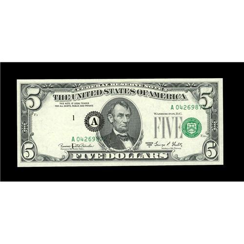 <B>Fr. 1972-A* $5 1969C Federal Reserve Star Note. Gem Crisp Uncirculated.</B></I> The third printing is located partially in the portrait area on this very scarce replacement note error.