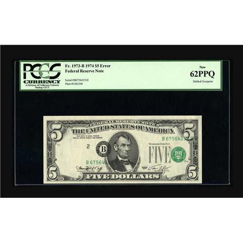 <B>Fr. 1973-B $5 1974 Federal Reserve Note. PCGS New 62PPQ.</B></I><BR>This is a moderately shifted error where the third printing is about 30% into the design.<BR><BR><b>Shipping:</b> Coin/Currency (<a target="_blank" href="http://www.heritageauctions.com/common/shipping.php">view shipping information</a>)