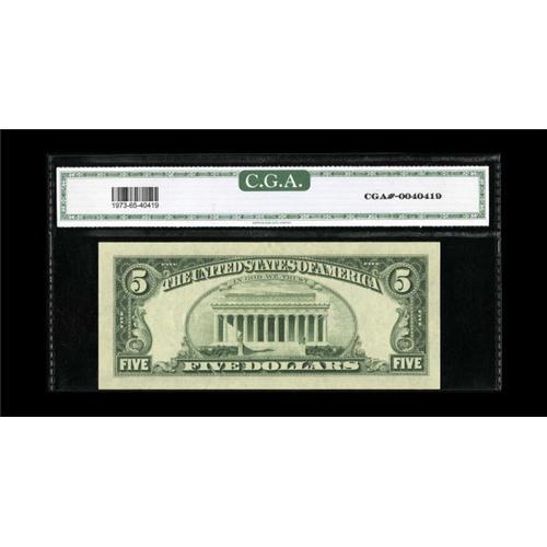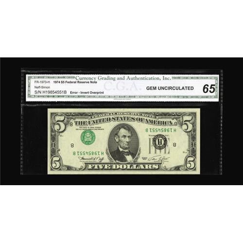 <B>Fr. 1973-H $5 1974 Federal Reserve Note. CGA Gem Uncirculated 65.</B></I><BR>A nifty Type 1 inverted third print on a St. Louis $5 with wide margins.