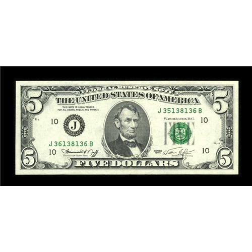 <B>Fr. 1973-J $5 1974 Federal Reserve Note. Very Fine-Extremely Fine.</B></I><BR>Only five of these type errors have appeared in any of our sales in the past five years attesting to the scarcity of the J36/J35 mismatch error.<BR><BR><b>Shipping:</b> Coins & Currency (<a target="_blank" href="http://www.heritageauctions.com/common/shipping.php">view shipping information</a>)