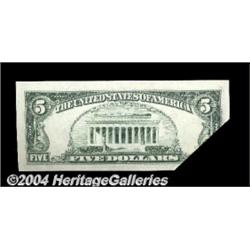 Fr. 1974-B $5 1977A Federal Reserve Note. Choice Crisp Uncirculated. A foldover with a portion of the district seal and the left serial number printed on the back and a corresponding portion of the face not receiving the third printing. <BR><BR><B>Important notice:</B> Heritage usually auctions material at the rate of 200-250 lots per hour. On some occasions eBay Live bid software or the Internet may not be able to keep up with the pace of the auction. We recommend placing a realistic absentee bid now as insurance to avoid disappointment. Occasionally the auctioneer may eliminate or reject an eBay Live bid, and the auctioneer may also reopen a lot after the close of the eBay live bidding (usually because we missed an audience bid), and may reject your bid even if it shows you as the winning bidder. By bidding via eBay Live, you agree that Heritage may award the lot to another bidder at its sole discretion under the circumstances described above or any other reasonable circumstances. Since eBay bids are not shown to us until we open the lot on the floor, we treat those bids just like floor bids. In most cases the floor responds before the eBay bid is presented to us, due to Internet lag time, so for consistency we have made it a policy that floor bids are always considered first over tie eBay live bids. Also please note that all Heritage lots purchased through eBay Live carry a 20% Buyer's Premium. Please make sure you read the Terms and Conditions before you bid. <BR><BR><B>IMPORTANT ANNOUNCEMENT ABOUT RESERVES:</B> Heritage now divulges all reserves on its web site 7 days before every auction. If you want to know whether the reserve on this lot has been met, and if not, what the reserve amount is, please visit this lot page on the HeritageCoin.com web site, or email: bid@HeritageGalleries.com