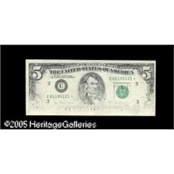 <B>Fr. 1974-C* $5 1977 Federal Reserve Note. Extremely Fine.</B></I> A Star note with the lower half of the face very weakly printed. A relatively common error in itself, but seldom encountered on a Star. Lot:15085