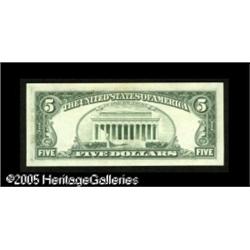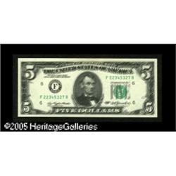 <B>Fr. 1974-F $5 1977 Federal Reserve Note. Gem New.</B></I><BR>A letter perfect example of this extremely dramatic type. Both printings are equally bold and they are well separated from each other, giving Lincoln four eyes, several of which fall on his two noses. A tremendous convergence of grade and rarity. Lot:15413