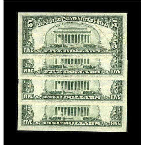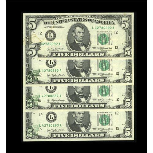 <B>Fr. 1974-L $5 1977 Federal Reserve Notes. Choice Crisp Uncirculated.</B></I><BR>This unusual error lot consists of three notes with light offsets in the lower left-hand corner plus the note that caused the offsets. This offset causing note has an accordion fold near the left-hand edge, unprinted areas within this fold, an approximate one inch tear, and a missing lower left corner. This note has these syptoms plus ink transference on the back and a small light spot. However, it does not have any circulation folds.<BR><BR><b>Shipping:</b> Coin/Currency (<a target="_blank" href="http://www.heritageauctions.com/common/shipping.php">view shipping information</a>)