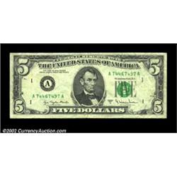 Fr. 1975-A $5 1977-A Federal Reserve Note. Fine-Very Fine.This is really a double error that circulated quite a while, as it has a gutter fold on the back and the back is slightly skewed. Important notice: We expect to be auctioning lots at the rate of 200-250 per hour. Sometimes eBay Premier live bid software cannot keep up with that pace, so we strongly recommend that you place a realistic proxy bid now as insurance to avoid disappointment. Also please note that all Heritage/CAA lots purchased through eBay Premier carry a 20% Buyer's Premium. Please make sure you read the Terms and Conditions.