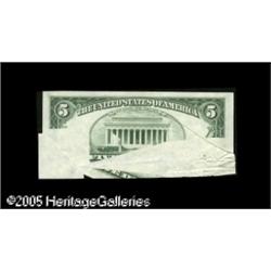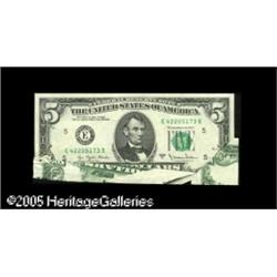 <B>Fr. 1975-E $5 1977A Federal Reserve Note. Choice New.</B></I><BR>A dramatic and complex folding error with major portions of the back on the face as well as a butterfly corner and multiple printed folds. Another great error for which the owner of the Taylor Family Collection paid nearly $4,000. Lot:15281