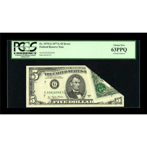 <B>Fr. 1975-G $5 1977A Federal Reserve Note. PCGS Choice New 63PPQ.</B></I><BR> This eye catching error remains in great shape with plenty of strong embossing present along with bright color.<BR><BR><b>Shipping:</b> Coins & Currency (<a target="_blank" href="http://www.heritageauctions.com/common/shipping.php">view shipping information</a>)
