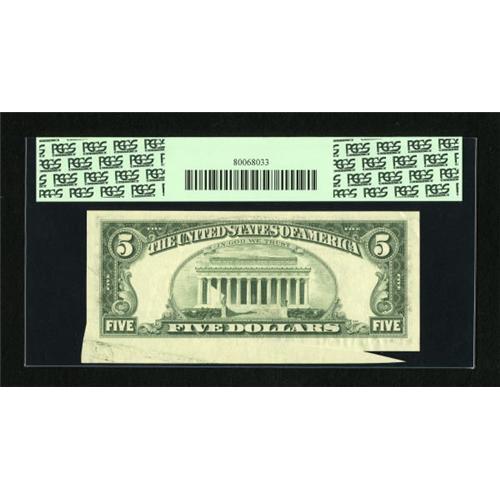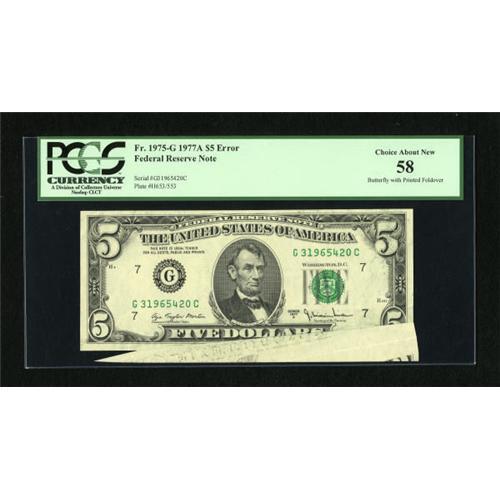 <B>Fr. 1975-G $5 1977A Federal Reserve Note. PCGS Choice About New 58.</B></I><BR> A neat foldover affects the face of this early $5 FRN.<BR><BR><b>Shipping:</b> Coins & Currency (<a target="_blank" href="http://www.heritageauctions.com/common/shipping.php">view shipping information</a>)