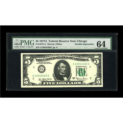 <B>Fr. 1975-G $5 1977A Federal Reserve Note. PMG Choice Uncirculated 64.</B></I> Two impressions of the face printing are clearly visible on this Chicago $5 FRN. A neat and desirable error.