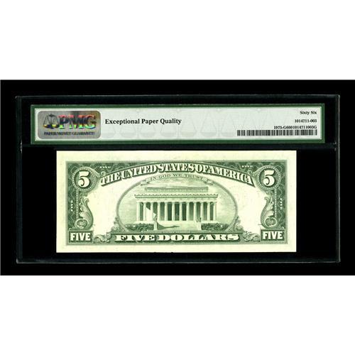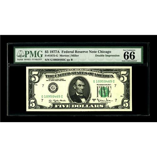 <B>Fr. 1975-G $5 1977A Federal Reserve Note. PMG Gem Uncirculated 66 EPQ.</B></I><BR>Face Plate 576 is clearly visible twice as the fuzziness is quite noticeable on this Green Seal $5. Also, given the fact that PMG really likes the paper doesn't hurt either.<BR><BR><b>Shipping:</b> Coin/Currency (<a target="_blank" href="http://www.heritageauctions.com/common/shipping.php">view shipping information</a>)