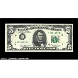 Fr. 1975-H $5 1977A Federal Reserve Note. Choice Crisp Uncirculated. A dramatic four digit mismatch, and as such a scarce item indeed. Important notice: We expect to be auctioning lots at the rate of 200-250 per hour. Sometimes eBay Premier live bid software cannot keep up with that pace, so we strongly recommend that you place a realistic proxy bid now as insurance to avoid disappointment. Also please note that all Heritage/CAA lots purchased through eBay Premier carry a 20% Buyer's Premium. Please make sure you read the Terms and Conditions.