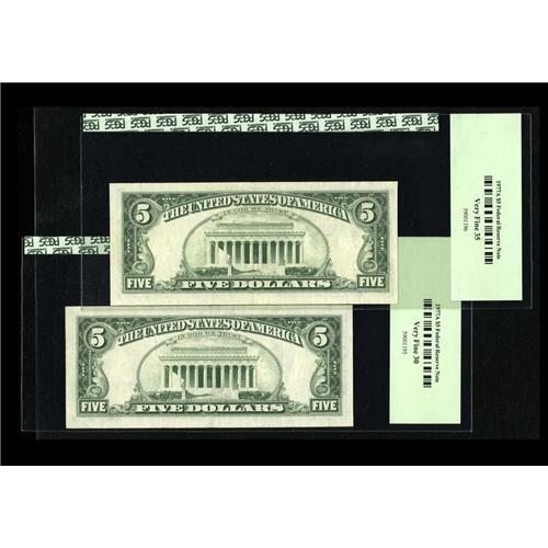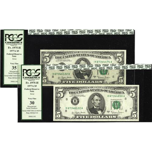 <B>Fr. 1975-H $5 1977A Federal Reserve Notes. Two Examples. PCGS Very Fine 30.</B></I><BR>A most intriguing pair as both notes carry four-digit mismatched serial numbers and their left-hand serial numbers are also the same number - H67346122A.